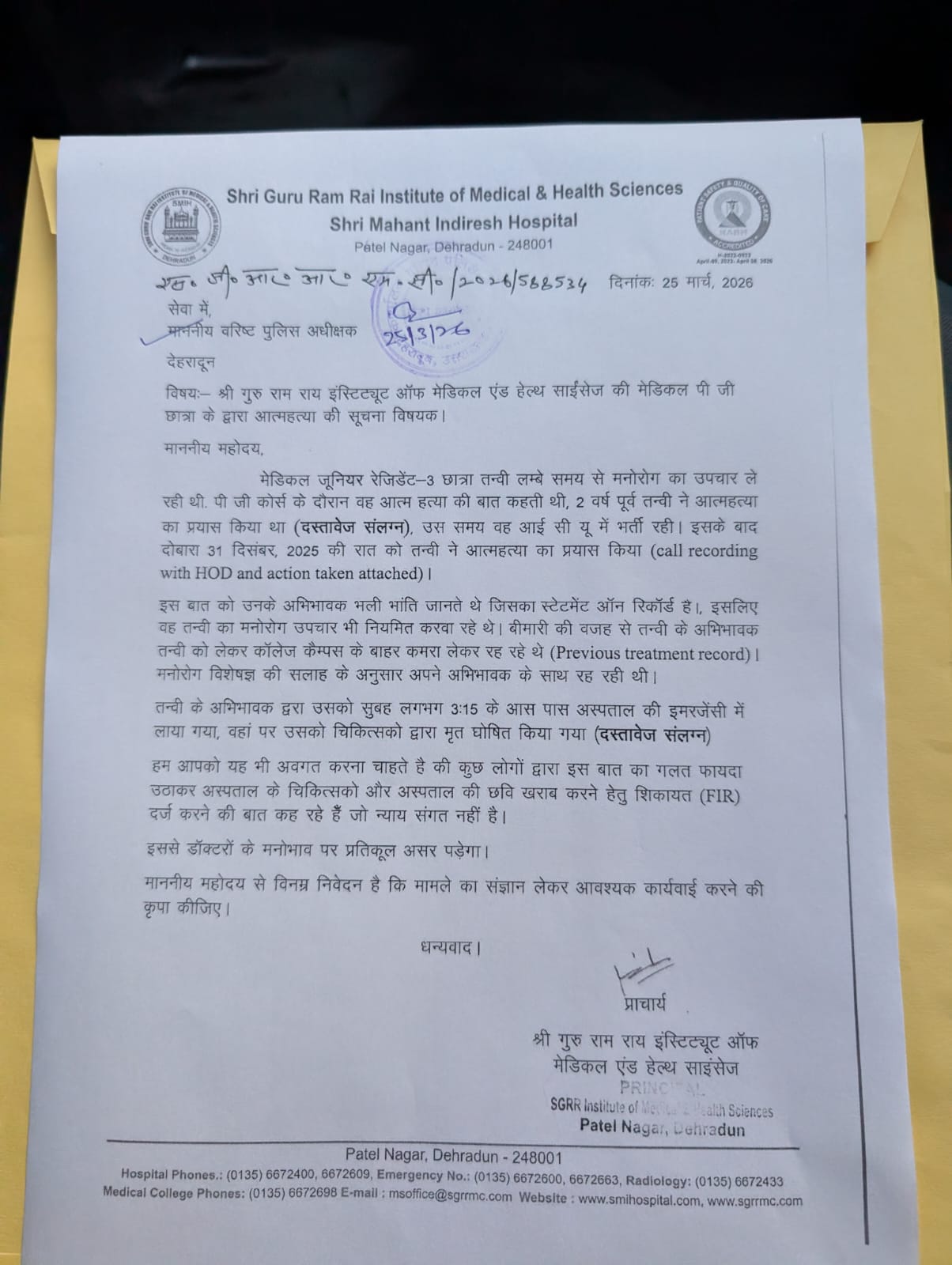 देहरादून। श्री गुरु राम राय इंस्टीट्यूट ऑफ मेडिकल एंड हेल्थ साइंसेज की पीजी डॉक्टर तन्वी की संदिग्ध मौत के मामले…