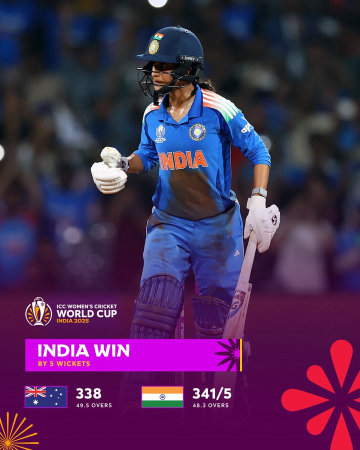 नवी मुंबई के डी.वाई पाटिल क्रिकेट स्टेडियम में खेले गए इस मैच में टॉस जीतकर पहले बल्लेबाजी करते हुए ऑस्ट्रेलिया ने 49.5 ओवर में 338 रन बनाए. भारत ने जीत के लिए मिले 339 रनों के लक्ष्य का पीछा 48.3 ओवर में 5 विकेट के नुकसान पर 341 रन बनाकर कर लिया और मैच को जीत लिया.