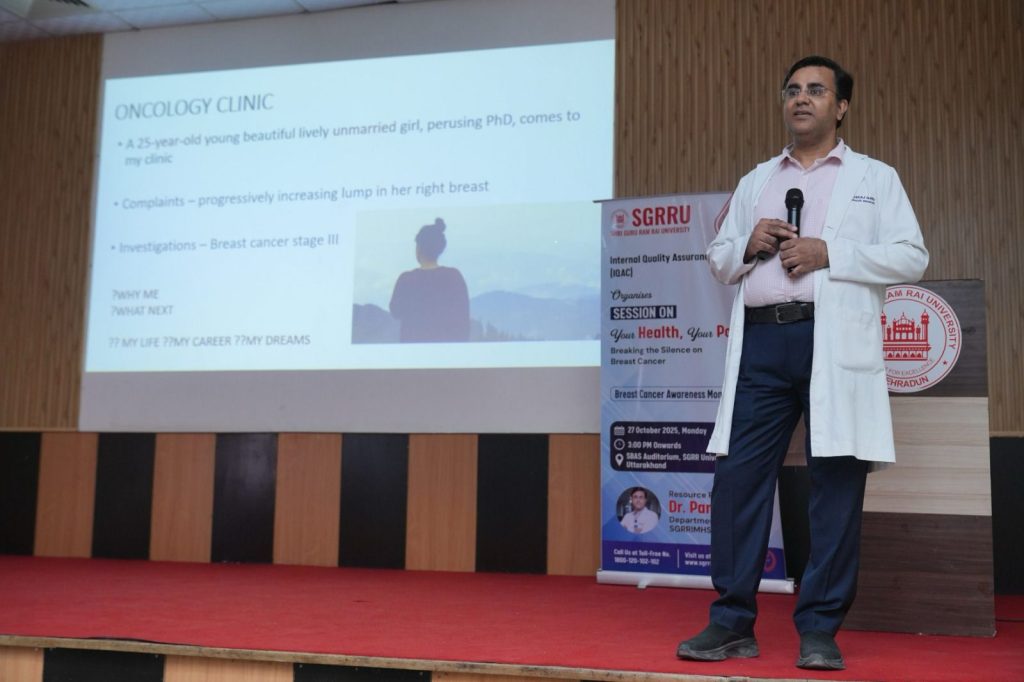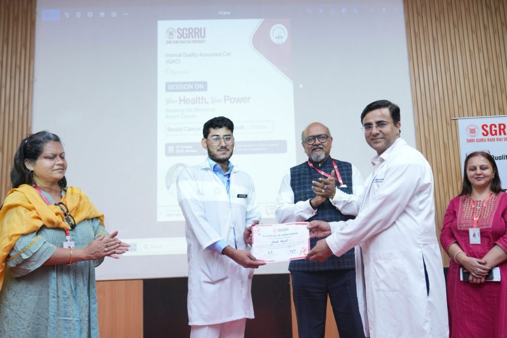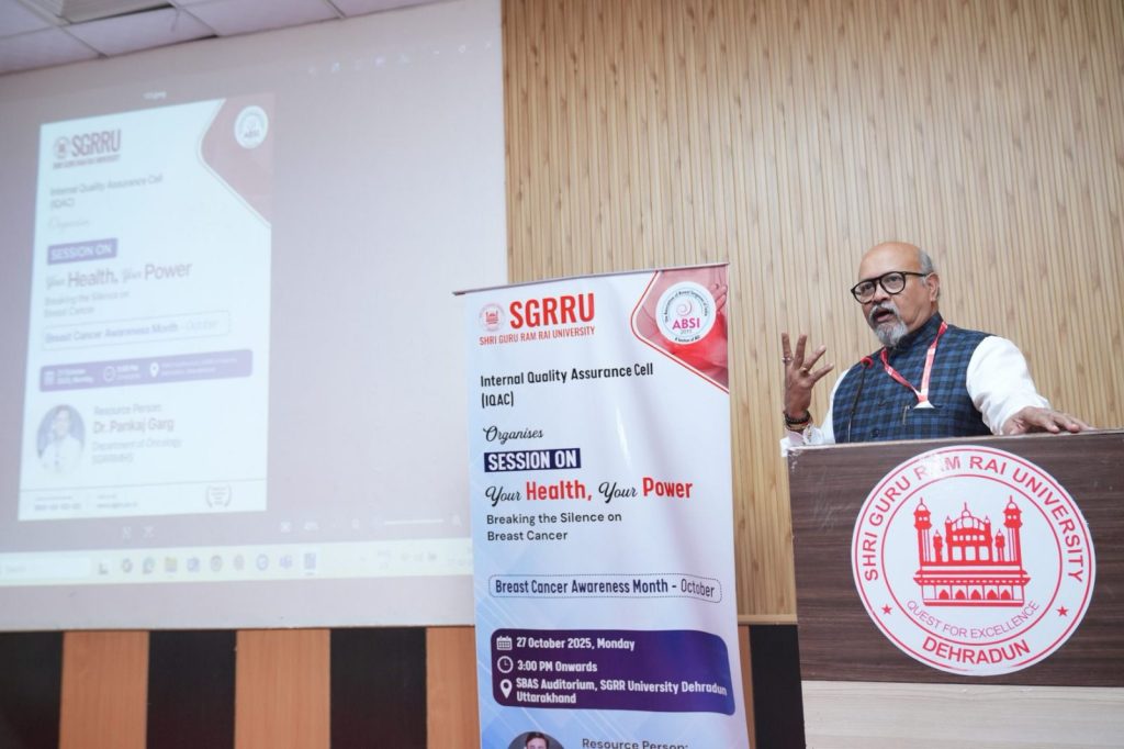स्तन कैंसर जागरूकता माह के अंतर्गत, श्री गुरु राम राय विश्वविद्यालय के आंतरिक गुणवत्ता आश्वासन प्रकोष्ठ (IQAC) द्वारा पोस्टर मेकिंग प्रतियोगिता एवं अतिथि व्याख्यान का आयोजन किया गया। इस कार्यक्रम का उद्देश्य छात्रों और अध्यापकों में स्तन कैंसर के प्रति जागरूकता बढ़ाना और समय पर जाँच एवं आत्म-परीक्षण के महत्व को समझाना था।