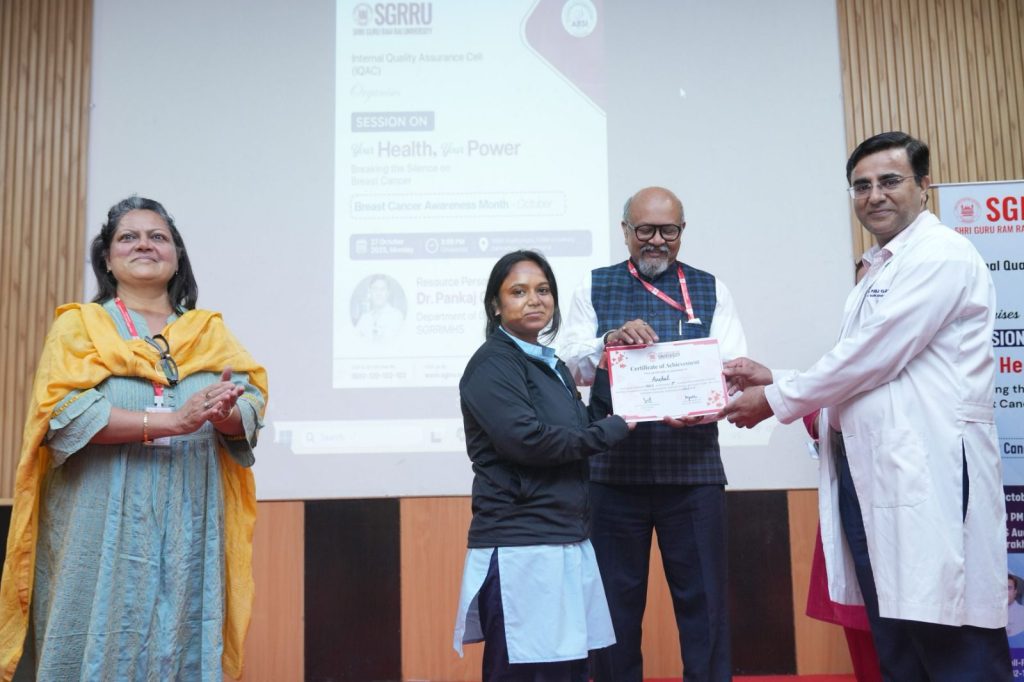 स्तन कैंसर जागरूकता माह के अंतर्गत, श्री गुरु राम राय विश्वविद्यालय के आंतरिक गुणवत्ता आश्वासन प्रकोष्ठ (IQAC) द्वारा पोस्टर मेकिंग प्रतियोगिता एवं अतिथि व्याख्यान का आयोजन किया गया। इस कार्यक्रम का उद्देश्य छात्रों और अध्यापकों में स्तन कैंसर के प्रति जागरूकता बढ़ाना और समय पर जाँच एवं आत्म-परीक्षण के महत्व को समझाना था।