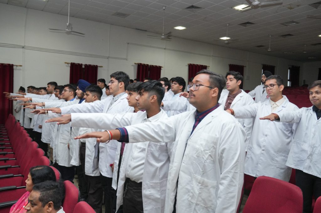 इस वाईट कोट सैरेमनी व चरक शपथ मे 134 नव आगुंतक (फ्रैशर) छात्र-छात्राओं ने बडे़ उत्साह के साथ प्रतिभाग किया। कार्यक्रम मे मंच संचालन डॉ. वाणी शर्मा द्वारा किया गया।