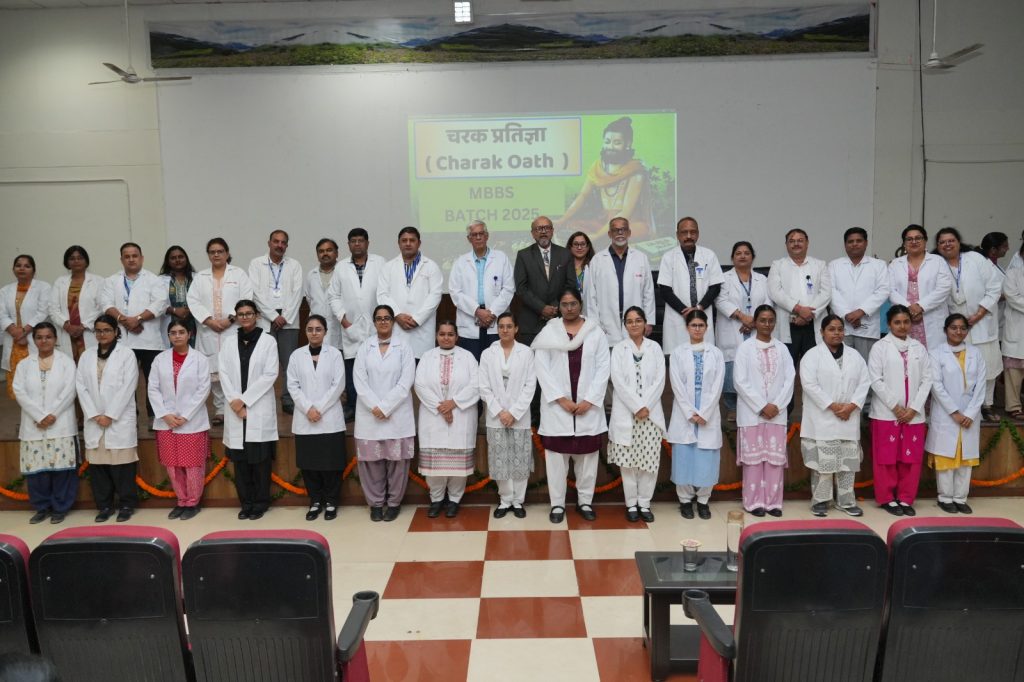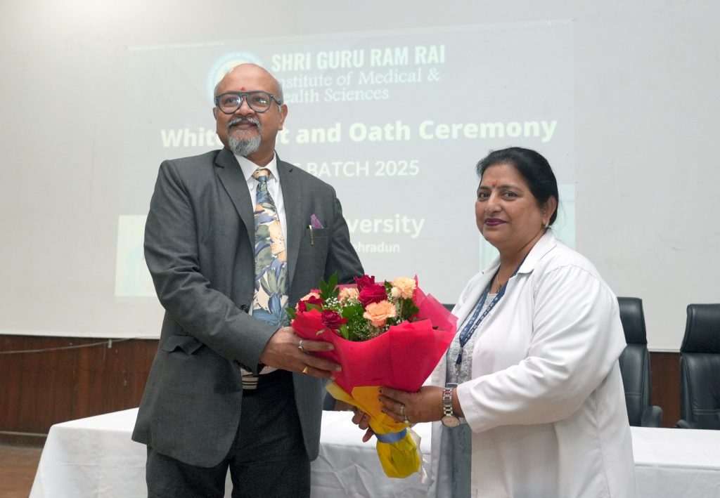 देहरादून। 06 अक्टूबर 2025ण् श्री गुरु राम राय राय इंस्टीट्यूट ऑफ मेडिकल एण्ड हैल्थ साइंसेज के नव आगंुतक (फ्रैशर) छात्र-छात्राओं की वाईट कोट सैरेमनी व चरक शपथ सम्पन्न हुई।