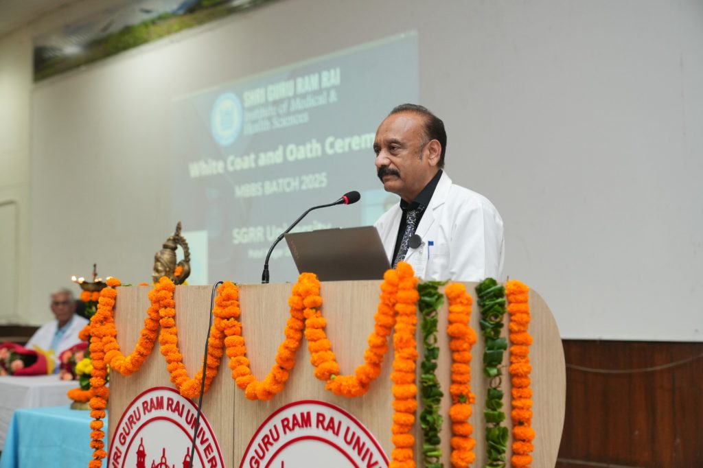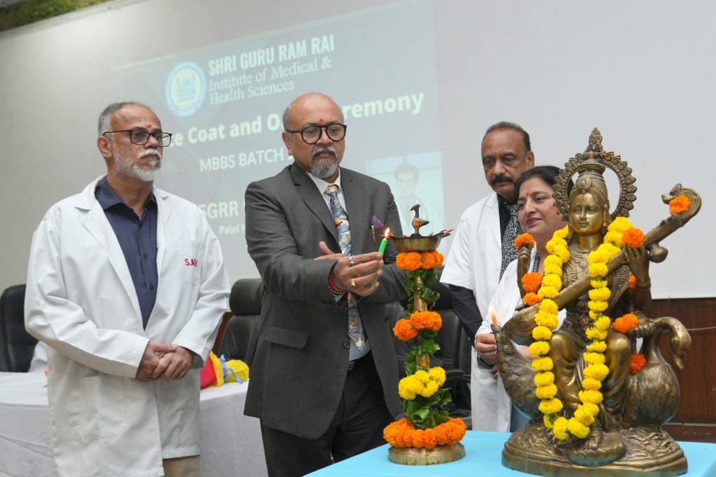एसजीआरआरआईएमएण्ड एचएस के सभागार में एमबीबीएस-वर्ष 2025 बैच के नव आगुंतक (फ्रैशर) छात्र-छात्राओं की वाईट कोट सैरेमनी व चरक शपथ श्री गुरु राम राय विश्वविद्यालय के वाईस चान्सलर इन्चार्ज एवं माननीय प्रेसिडे़ंट के सलाहकार प्रो.डॉ. प्रथप्पन के पिल्लई, एचजीआरआरआईएमएण्डएचएस के निदेशक डॉ. मनोज कुमार गुप्ता, प्राचार्य डॉ. अशोक नायक व श्री महंत इन्दिरेश अस्पताल के मुख्य चिकित्साधीक्षक डॉ. कर्नल अनिल मलिक द्वारा सम्पन्न करवाई गई। कार्यक्रम का शुभारंभ मुख्य अतिथि श्री गुरु राम राय विश्वविद्यालय के वाईस चान्सलर इन्चार्ज एवं माननीय प्रेसिडे़ंट के सलाहकार प्रो.डॉ. प्रथप्पन के पिल्लई, निदेशक डॉ. मनोज कुमार गुप्ता, प्राचार्य डॉ. अशोक नायक व श्री महंत इन्दिरेश अस्पताल के मुख्य चिकित्साधीक्षक डॉ. कर्नल अनिल मलिक द्वारा दीप प्रज्जवलित कर किया गया।